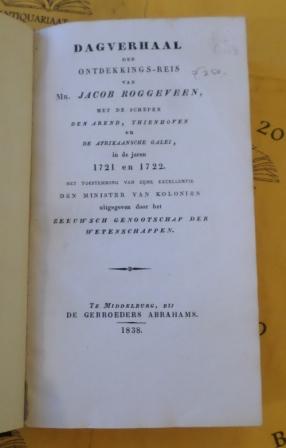 XL, 205, 23 p. hlinn. 13x22 cm. ill. Met een portret van Arent Roggeveen, een Facsimile der handteekening van Mr. Jacob Roggeveen, geslachtlijst van Roggeveen, een plaat van het schip Tartaan en een grote uitslaande Kaart der Ontdekkings-Reize van Mr. J. Roggeveen. De kaart heeft een scheurtje. Compleet. In latere, blinde band. Ex-libris op de binnenzijde van het voorplat. Goede staat.